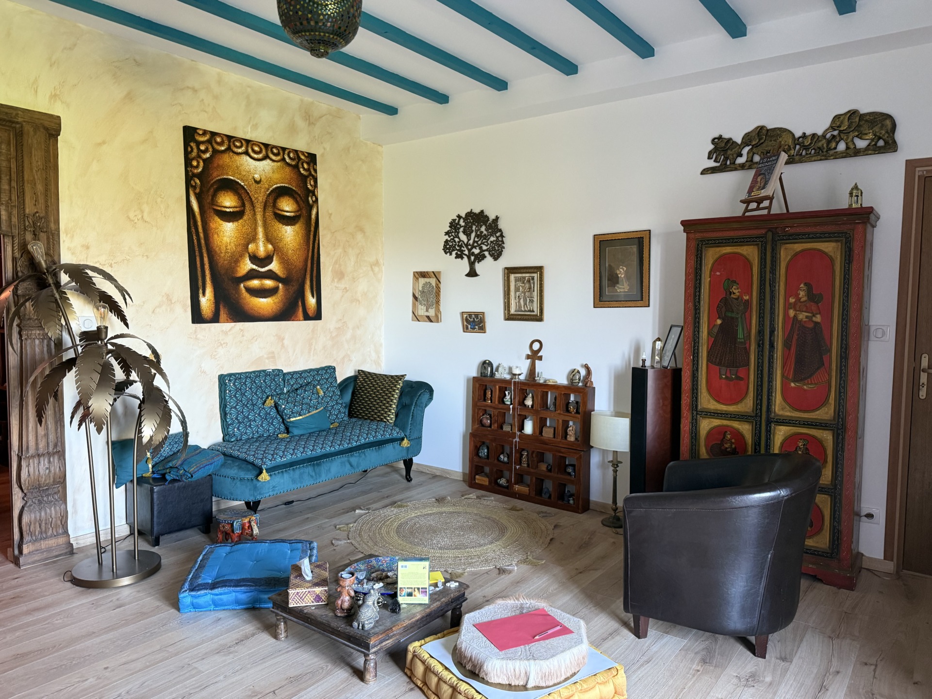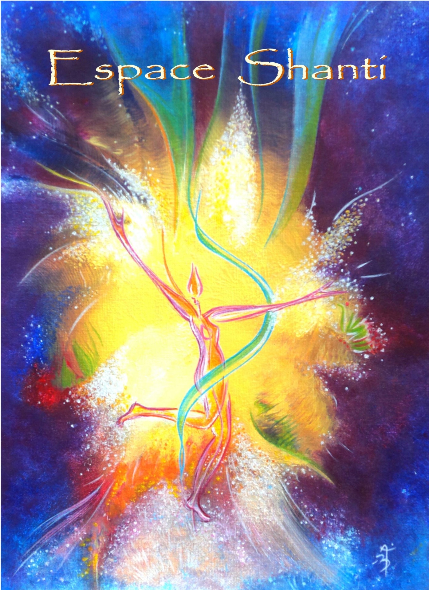 Cette oeuvre a été créée par Béatrice Robin, amie et intervenante à Shanti, (occasionnellement lors de ses passages en Bourbonnais). Elle insuffle tout ce que nous avons déposé pour cet Espace: légèreté, fluidité, connexion Terre-Ciel, Sacré, Danse de la Vie, célébration… Merci Béatrice